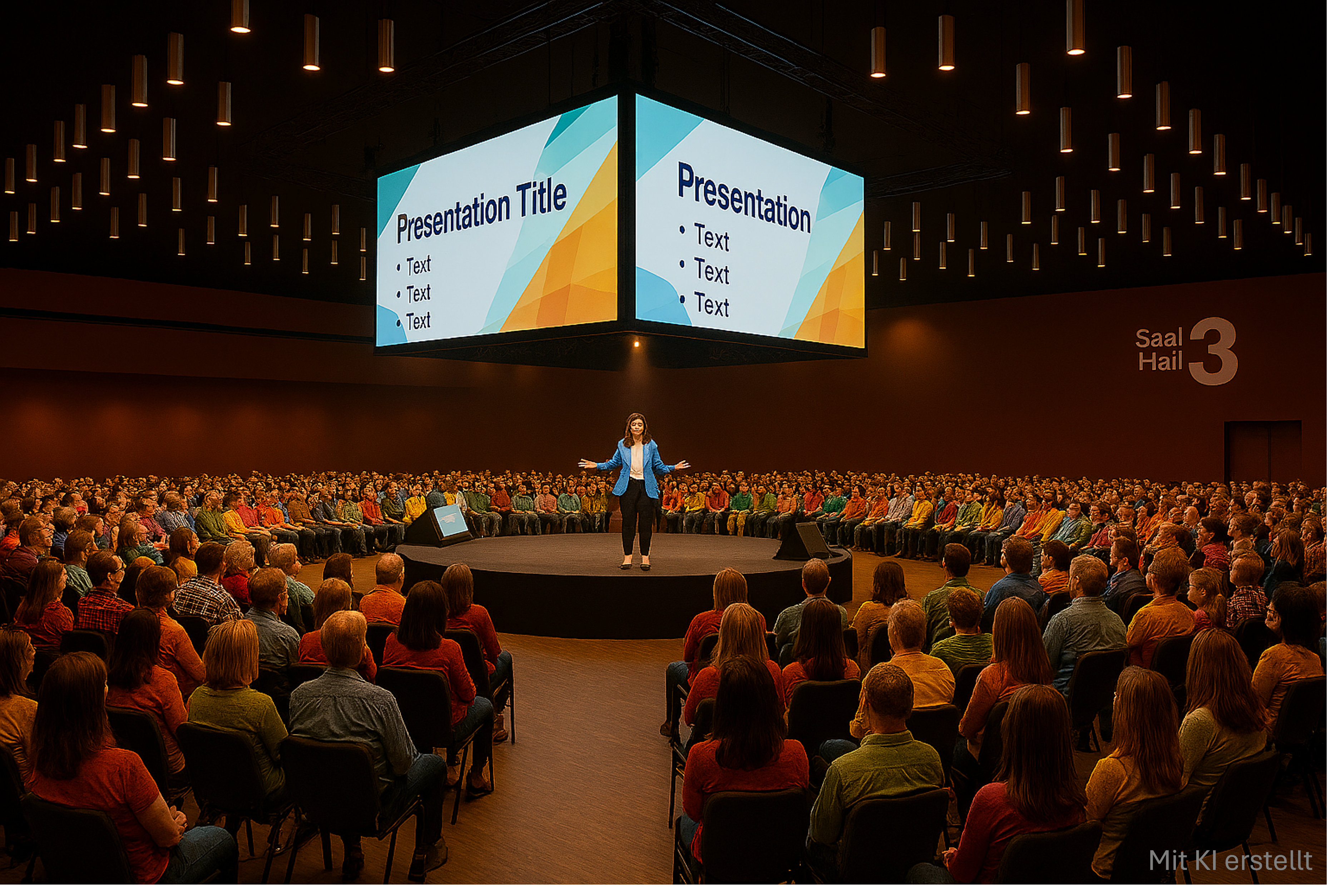 The audience will be seated in a circular arrangement around a stage of approximately 5 x 5 meters. Your presentation will be displayed on a cube screen suspended above the stage.